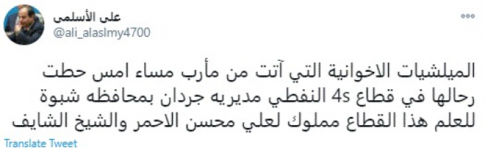 وقال في تغريدة عبر "تويتر" رصدها "المشهد العربي": "المليشيات الإخوانية التي آتت من مأرب مساء أمس حطت رحالها في قطاع 4s النفطي مديرية جردان بمحافظة شبوة للعلم هذا القطاع مملوك لعلي محسن الأحمر والشيخ الشايف".