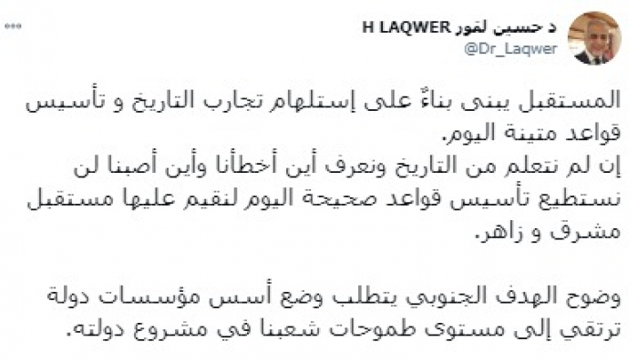 وتابع: "وضوح الهدف الجنوبي يتطلب وضع أسس مؤسسات دولة ترتقي إلى مستوى طموحات شعبنا في مشروع دولته".