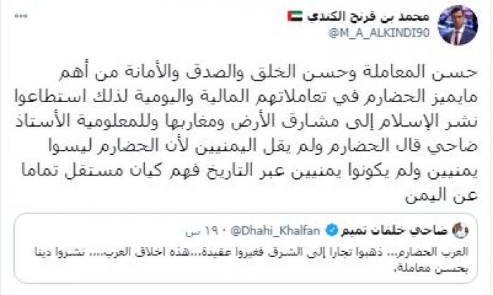 وقال في تغريدة على حسابه بموقع التدوين المصغر (تويتر)، اليوم إن: "حسن المعاملة وحسن الخلق والصدق والأمانة من أهم ما يميز الحضارم في تعاملاتهم المالية واليومية لذلك استطاعوا نشر الإسلام إلى مشارق الأرض ومغاربها".