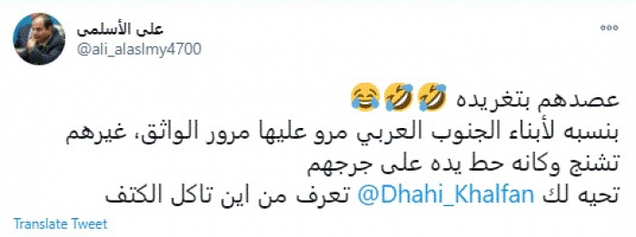 وقال في تغريدة عبر "تويتر" رصدها "المشهد العربي": "عصدهم بتغريدة بالنسبة لأبناء الجنوب العربي مروا عليها مرور الواثق، غيرهم تشنج وكأنه حط يده على جرحهم تحية لك ضاحي خلفان تعرف من أين تؤكل الكتف".