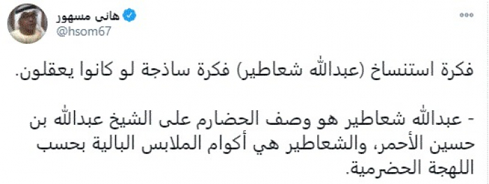 وقال في تغريدة عبر "تويتر" رصدها "المشهد العربي": "فكرة استنساخ (عبدالله شعاطير) فكرة ساذجة لو كانوا يعقلون. عبدالله شعاطير هو وصف الحضارم على الشيخ عبدالله بن حسين الأحمر، والشعاطير هي أكوام الملابس البالية بحسب اللهجة الحضرمية".