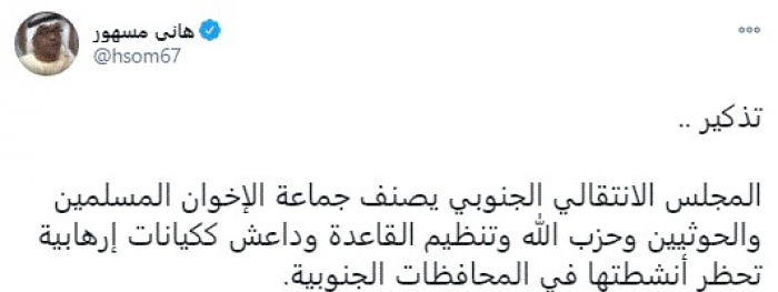 وكتب في تغريدة عبر "تويتر" رصدها "المشهد العربي": "تذكير.. المجلس الانتقالي الجنوبي يصنف جماعة الإخوان المسلمين والحوثيين وحزب الله وتنظيم القاعدة وداعش ككيانات إرهابية تحظر أنشطتها في المحافظات الجنوبية".