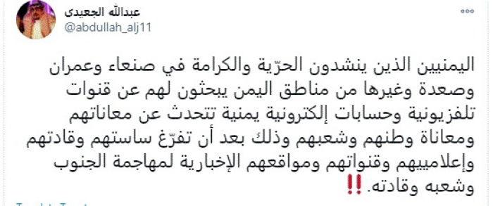وكتب في تغريدة عبر "تويتر" رصدها "المشهد العربي": "اليمنيين الذين ينشدون الحرّية والكرامة في صنعاء وعمران وصعدة وغيرها من مناطق اليمن يبحثون لهم عن قنوات تلفزيونية وحسابات إلكترونية يمنية تتحدث عن معاناتهم ومعاناة وطنهم وشعبهم وذلك بعد أن تفرّغ ساستهم وقادتهم وإعلامييهم وقنواتهم ومواقعهم الإخبارية لمهاجمة الجنوب وشعبه وقادته".