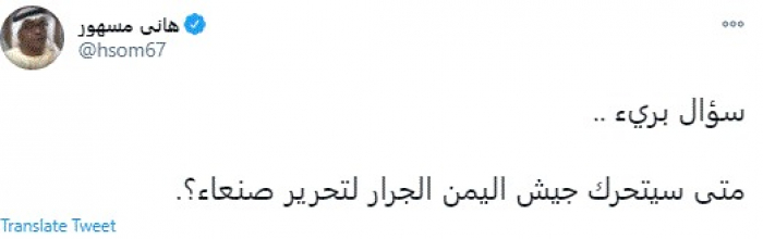 وقال في تغريدة عبر "تويتر" رصدها "المشهد العربي": "سؤال بريء.. متى سيتحرك جيش اليمن الجرار لتحرير صنعاء؟".