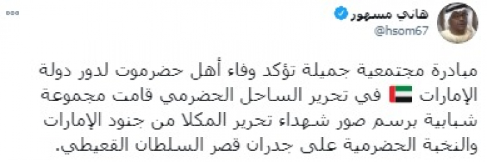 وقال في تغريدة على حسابه بموقع التدوين المصغر (تويتر)، اليوم إن: "مبادرة مجتمعية جميلة تؤكد وفاء أهل حضرموت لدور دولة الإمارات في تحرير الساحل الحضرمي".