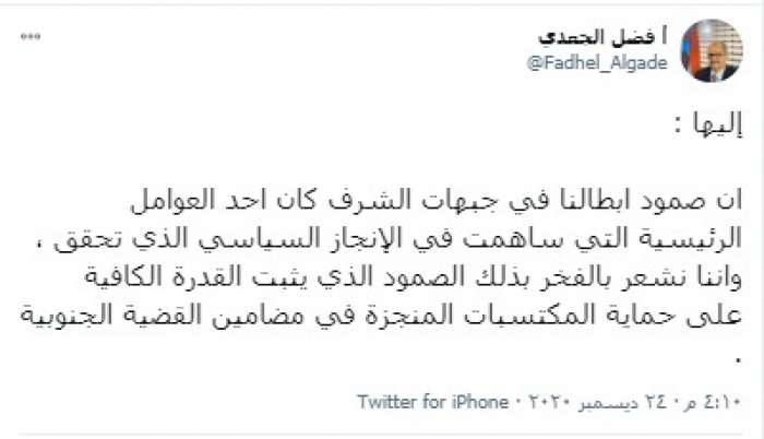 وكتب "الجعدي" تغريدة عبر حسابه بتويتر، رصدها "المشهد العربي": "إن صمود أبطالنا في جبهات الشرف كان أحد العوامل الرئيسية التي ساهمت في الإنجاز السياسي الذي تحقق، وأننا نشعر بالفخر بذلك الصمود الذي يثبت القدرة الكافية على حماية المكتسبات المنجزة في مضامين القضية الجنوبية".