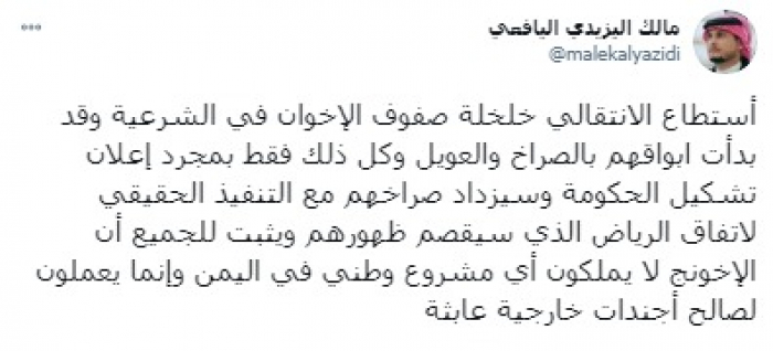 وشدد في تغريدة على حسابه بموقع التدوين المصغر تويتر، اليوم على أن: "استطاع الانتقالي خلخلة صفوف الإخوان في الشرعية وقد بدأت أبواقهم بالصراخ والعويل، وكل ذلك فقط بمجرد إعلان تشكيل الحكومة".
