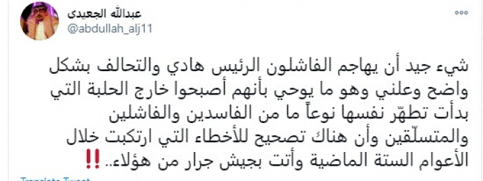 وكتب في تغريدة عبر "تويتر" رصدها "المشهد العربي": "شيء جيد أن يهاجم الفاشلون الرئيس هادي والتحالف بشكل واضح وعلني وهو ما يوحي بأنهم أصبحوا خارج الحلبة التي بدأت تطهّر نفسها نوعًا ما من الفاسدين والفاشلين والمتسلّقين وأن هناك تصحيح للأخطاء التي ارتكبت خلال الأعوام الستة الماضية وأتت بجيش جرار من هؤلاء".
