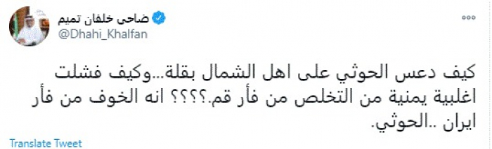 انتقد نائب مدير الشرطة والأمن العام في دبي ضاحي خلفان، اليوم، خوف أهل اليمن الشمالي من فأر إيران – في إشارة لزعيم مليشيات الحوثي الإرهابية المدعو عبدالملك الحوثي-.