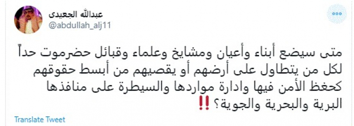وقال في تغريدة عبر "تويتر" رصدها "المشهد العربي": "متى سيضع أبناء وأعيان ومشايخ وعلماء وقبائل حضرموت حدًا لكل من يتطاول على أرضهم أو يقصيهم من أبسط حقوقهم كحفظ الأمن فيها وإدارة مواردها والسيطرة على منافذها البرية والبحرية والجوية؟".
