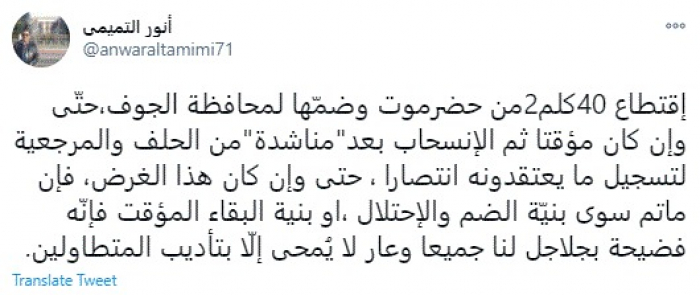 وكتب في تغريدة عبر "تويتر" رصدها "المشهد العربي": "اقتطاع 40 كلم2 من حضرموت وضمّها لمحافظة الجوف، حتّى وإن كان مؤقتًا ثم الإنسحاب بعد مناشدة من الحلف والمرجعية لتسجيل ما يعتقدونه انتصارًا، حتى وإن كان هذا الغرض، فإن ماتم سوى بنيّة الضم والإحتلال، أو بنية البقاء المؤقت فإنّه فضيحة بجلاجل لنا جميعًا وعار لا يُمحى إلّا بتأديب المتطاولين".