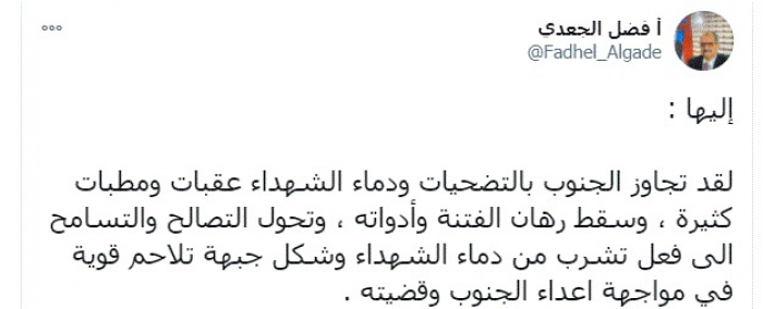 وكتب في تغريدة عبر "تويتر" رصدها "المشهد العربي": "لقد تجاوز الجنوب بالتضحيات ودماء الشهداء عقبات ومطبات كثيرة، وسقط رهان الفتنة وأدواته".