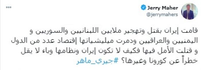 وشدد على أنها: "دمرت مليشياتها اقتصاد عدد من الدول وقتلت الأمل فيها فكيف لا تكون إيران ونظامها وباء لا يقل خطرًا عن كورونا وغيرها؟".