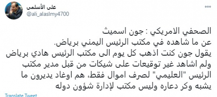 وقال في تغريدة عبر "تويتر" رصدها "المشهد العربي": "الصحفي الأمريكي جون إسميث عن ما شاهده في مكتب الرئيس اليمني بالرياض. يقول جون كنت أذهب كل يوم إلى مكتب الرئيس هادي بالرياض ولم أشاهد غير توقيعات على شيكات من قبل مدير مكتب الرئيس العليمي لصرف أموال فقط، هم أوغاد يُديرون ما يشبه وكر .... وليس مكتب لإدارة شؤون دولة".
