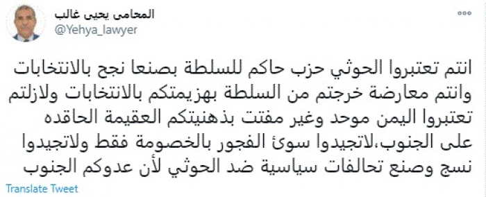 وقال في تغريدة عبر "تويتر" رصدها "المشهد العربي": "أنتم تعتبروا الحوثي حزب حاكم للسلطة بصنعاء نجح بالانتخابات وأنتم معارضة خرجتم من السلطة بهزيمتكم بالانتخابات ولازلتم تعتبروا اليمن موحد وغير مفتت بذهنيتكم العقيمة الحاقدة على الجنوب".