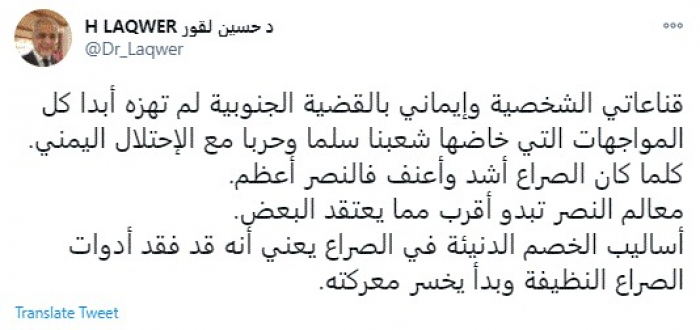 وكتب في تغريدة عبر "تويتر" رصدها "المشهد العربي": "قناعاتي الشخصية وإيماني بالقضية الجنوبية لم تهزه أبدًا كل المواجهات التي خاضها شعبنا سلمًا وحربًا مع الاحتلال اليمني".