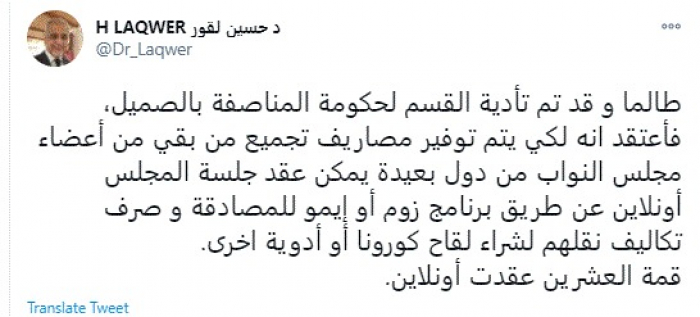 وقال في تغريدة عبر "تويتر" رصدها "المشهد العربي": "طالما وقد تم تأدية القسم لحكومة المناصفة بالصميل، فأعتقد أنه لكي يتم توفير مصاريف تجميع من بقي من أعضاء مجلس النواب من دول بعيدة يمكن عقد جلسة المجلس أونلاين عن طريق برنامج زوم أو إيمو للمصادقة وصرف تكاليف نقلهم لشراء لقاح كورونا أو أدوية أخرى. قمة العشرين عقدت أونلاين".