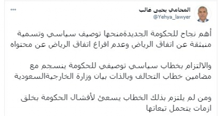 وكتب "غالب" تغريدة عبر حسابه بتويتر، رصدها "المشهد العربي": "أهم نجاح للحكومة الجديدة منحها توصيفا سياسيا وتسمية منبثقة عن اتفاق الرياض وعدم إفراغ اتفاق الرياض عن محتواه".