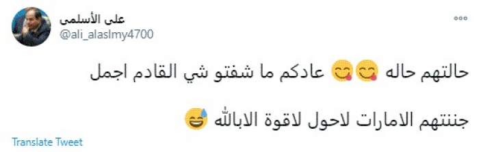 وقال في تغريدة عبر "تويتر" رصدها "المشهد العربي": "حالتهم حالة عادكم ما شفتوا شيء القادم أجمل.. جننتهم الإمارات لا حول لا قوة إلا بالله".