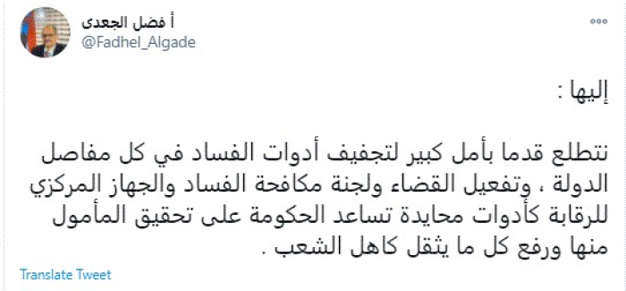 وقال في تغريدة عبر "تويتر" رصدها "المشهد العربي": "نتطلع قدما بأمل كبير لتجفيف أدوات الفساد في كل مفاصل الدولة ، وتفعيل القضاء ولجنة مكافحة الفساد والجهاز المركزي للرقابة كأدوات محايدة تساعد الحكومة على تحقيق المأمول منها ورفع كل ما يثقل كاهل الشعب".