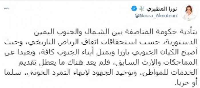 وقالت في تغريدة على حسابها بموقع التدوين المصغر تويتر، اليوم إنه: "بتأدية حكومة المناصفة بين الشمال والجنوب اليمين الدستورية، حسب استحقاقات اتفاق الرياض التاريخي، وحيث أصبح الكيان الجنوبي بارزا ويمثل أبناء الجنوب كافة، وبعيدا عن المماحكات والإرث السابق، فلم يعد هناك ما يعطل تقديم الخدمات للمواطن، وتوحيد الجهود لإنهاء التمرد الحوثي، سلما أو حربا".