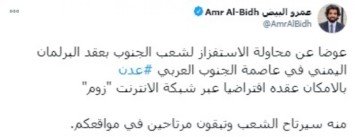 وأكد في تغريدة على حسابه بموقع التدوين المصغر تويتر، اليوم أنه: "عوضا عن محاولة الاستفزاز لشعب الجنوب بعقد البرلمان اليمني في عاصمة الجنوب العربي عدن بالإمكان عقده افتراضيا عبر شبكة الإنترنت (زوم)".