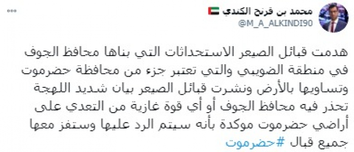 وأكد في تغريدة على حسابه بموقع التدوين المصغر تويتر، اليوم أنه: "هدمت قبائل الصيعر الاستحداثات التي بناها محافظ الجوف في منطقة الضويبي والتي تعتبر جزءا من محافظة حضرموت وتساويها بالأرض".