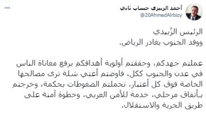 وأوضح في تغريدة على حسابه بموقع التدوين المصغر تويتر، اليوم أن: "الرئيس الزُبيدي ووفد الجنوب يغادران الرياض".