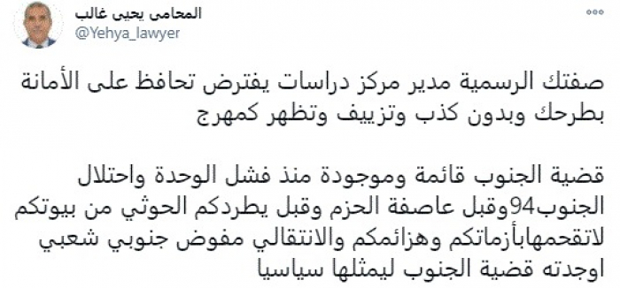 وأضاف: "قضية الجنوب قائمة وموجودة منذ فشل الوحدة واحتلال الجنوب94 وقبل عاصفة الحزم وقبل يطردكم الحوثي من بيوتكم لا تقحمها بأزماتكم وهزائمكم والانتقالي مفوض جنوبي شعبي أوجدته قضية الجنوب ليمثلها سياسيًا".