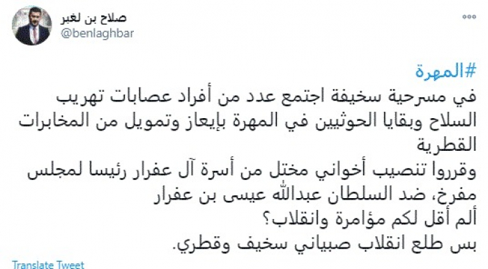 وقال في تغريدات عبر "تويتر" رصدها "المشهد العربي": "المهرة.. في مسرحية سخيفة اجتمع عدد من أفراد عصابات تهريب السلاح وبقايا الحوثيين في المهرة بإيعاز وتمويل من المخابرات القطرية وقرروا تنصيب أخواني مختل من أسرة آل عفرار رئيسًا لمجلس مفرخ، ضد السلطان عبدالله عيسى بن عفرار".