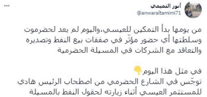 وقال في تغريدة على حسابه بموقع التدوين المصغر تويتر، اليوم إنه: "من يومها بدأ التمكين للعيسي، واليوم لم يعد لحضرموت وسلطتها أي حضور مؤثّر في صفقات بيع النفط وتصديره والتعاقد مع الشركات في المسيلة الحضرمية".