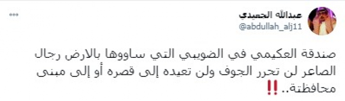 وأوضح في تغريدة على حسابه بموقع التدوين المصغر تويتر، اليوم أن: "صندقة العكيمي في الضويبي التي ساواها بالأرض رجال الصيعر لن تحرر الجوف ولن تعيده إلى قصره أو إلى مبنى محافظته".
