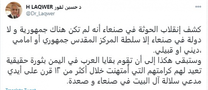 وأضاف: "وستبقى هكذا إلى أن تقوم بقايا العرب في اليمن بثورة حقيقية تعيد لهم كرامتهم التي أمتهنت خلال أكثر من 12 قرن على أيدي مدعي سلالة آل البيت في صنعاء وصعدة".
