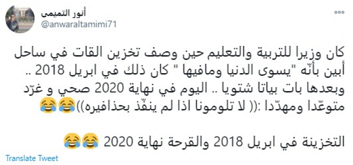 وأضاف: "اليوم في نهاية 2020 صحي وغرّد متوعّدًا ومهدّدًا ((لا تلومونا اذا لم ينفّذ بحذافيره)).. التخزينة في إبريل 2018 والقرحة نهاية 2020".