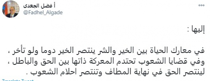 وكتب في تغريدة عبر "تويتر" رصدها "المشهد العربي": "في معارك الحياة بين الخير والشر ينتصر الخير دومًا ولو تأخر، وفي قضايا الشعوب تحتدم المعركة ذاتها بين الحق والباطل، لينتصر الحق في نهاية المطاف وتنتصر أحلام الشعوب".