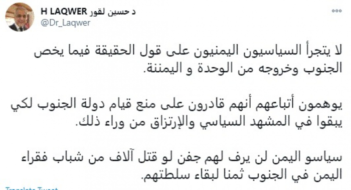 وكتب في تغريدة عبر "تويتر" رصدها "المشهد العربي": "لا يتجرأ السياسيون اليمنيون على قول الحقيقة فيما يخص الجنوب وخروجه من الوحدة واليمننة".