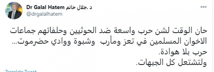وقال في تغريدة عبر "تويتر" رصدها "المشهد العربي": "حان الوقت لشن حرب واسعة ضد الحوثيين وحلفائهم جماعات الإخوان المسلمين في تعز ومأرب وشبوة ووادي حضرموت... حرب بلا هوادة".