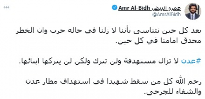 نعى عمرو البيض، عضو هيئة رئاسة المجلس الانتقالي الجنوبي، ضحايا استهداف مطار العاصمة عدن، مؤكدا أن الجنوب في حالة حرب، وأن عدن لا تزال مستهدفة.