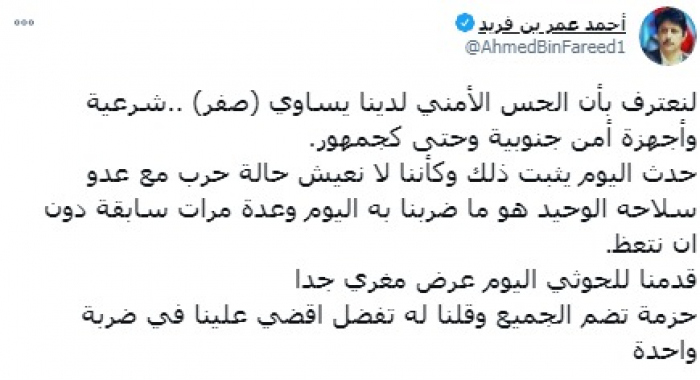 وقال في تغريدة على حسابه بموقع التدوين المصغر تويتر، اليوم: "لنعترف بأن الحس الأمني لدينا يساوي (صفرا).. شرعية وأجهزة أمن جنوبية وحتى كجمهور.