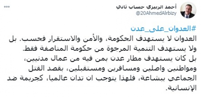 وتابع: "بل ولا يستهدف التنمية المرجوة من حكومة المناصفة فقط"، مشددا على أنه: "كان يستهدف مطار عدن بمن فيه من عمال مدنيين، ومواطنين واصلين ومسافرين ومستقبلين، بقصد القتل الجماعي ببشاعة".