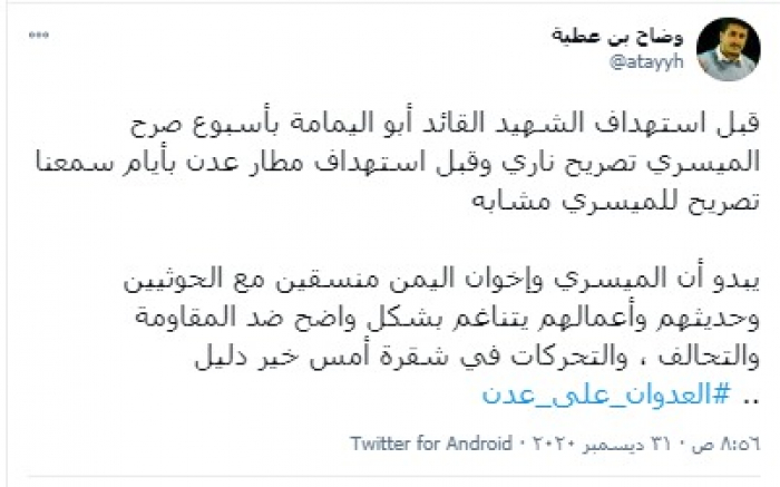 وكتب "بن عطية" تغريدة عبر حسابه بتويتر، رصدها "المشهد العربي": "قبل استهداف الشهيد القائد أبو اليمامة بأسبوع صرح الميسري تصريح ناري وقبل استهداف مطار عدن بأيام سمعنا تصريح للميسري مشابه".
