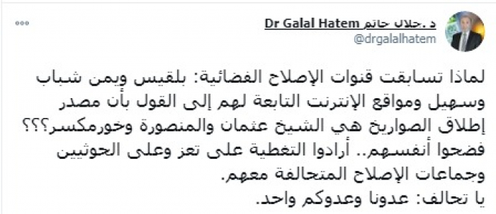 وتساءل في تغريدة على حسابه بموقع التدوين المصغر تويتر، اليوم قائلا: "لماذا تسابقت قنوات الإصلاح الفضائية: (بلقيس ويمن شباب وسهيل ومواقع الإنترنت التابعة لهم على القول بأن مصدر إطلاق الصواريخ هي الشيخ عثمان والمنصورة وخورمكسر؟؟؟)".