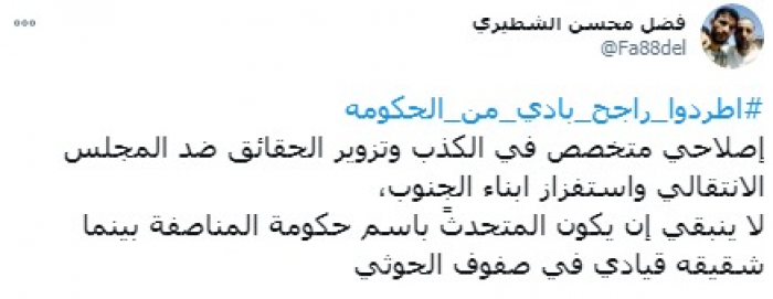 وقال في تغريدة على حسابه بموقع التدوين المصغر تويتر، اليوم: "اطردوا راجح بادي من الحكومة"، مؤكدا أنه: "إصلاحي متخصص في الكذب وتزوير الحقائق ضد المجلس الانتقالي واستفزاز أبناء الجنوب".