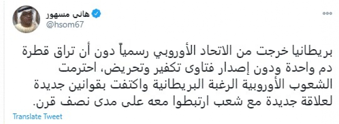 وقال في تغريدة عبر "تويتر" رصدها "المشهد العربي": "بريطانيا خرجت من الاتحاد الأوروبي رسميًا دون أن تراق قطرة دم واحدة ودون إصدار فتاوى تكفير وتحريض، احترمت الشعوب الأوروبية الرغبة البريطانية واكتفت بقوانين جديدة لعلاقة جديدة مع شعب ارتبطوا معه على مدى نصف قرن".