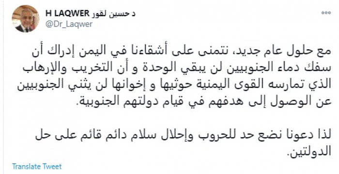 وقال في تغريدة عبر "تويتر" رصدها "المشهد العربي": "مع حلول عام جديد، نتمنى على أشقاءنا في اليمن إدراك أن سفك دماء الجنوبيين لن يبقي الوحدة وأن التخريب والإرهاب الذي تمارسه القوى اليمنية حوثيها وإخوانها لن يثني الجنوبيين عن الوصول إلى هدفهم في قيام دولتهم الجنوبية".
