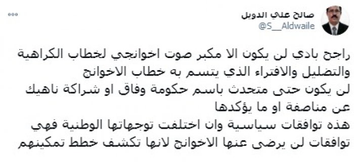شدد الناشط السياسي صالح الدويل، على أن خطاب الإخواني المدعو راجح بادي المتحدث باسم الحكومة يتسم بالكراهية والافتراء والتضليل، موضحا أنه لا يستحق موقعه.