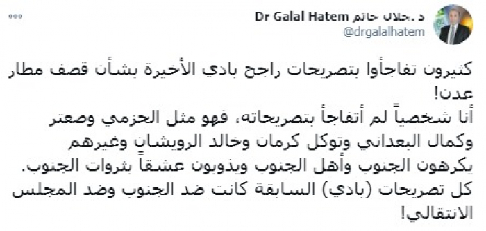 وأوضح في تغريدة على حسابه بموقع التدوين المصغر تويتر، اليوم أن: "كثيرين تفاجأوا بتصريحات راجح بادي الأخيرة بشأن قصف مطار عدن".
