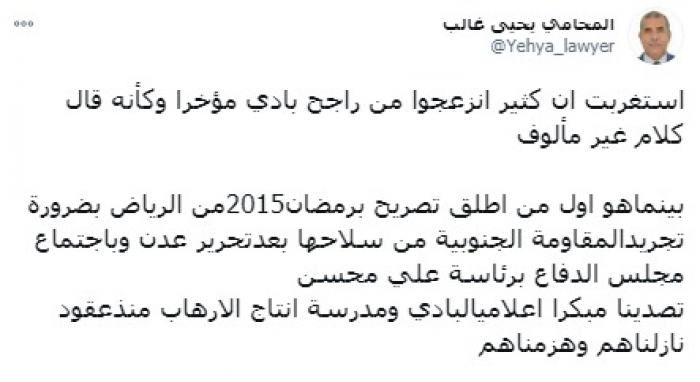 وتابع: "كأنه قال كلاما غير مألوف بينما هو أول من أطلق تصريحا برمضان 2015 من الرياض بضرورة تجريد المقاومة الجنوبية من سلاحها بعد تحرير عدن وباجتماع مجلس الدفاع برئاسة علي محسن".