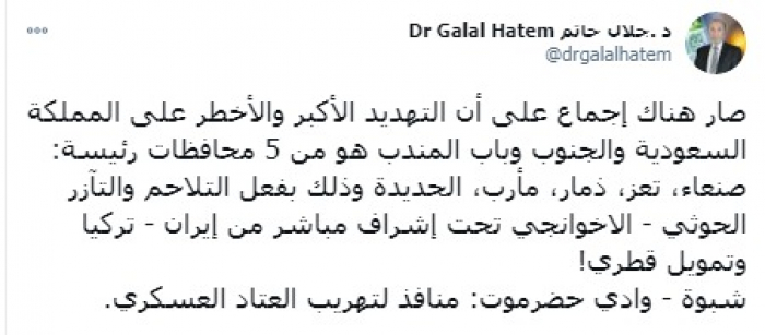وقال في تغريدة على حسابه بموقع التدوين المصغر تويتر، اليوم إنه: "صار هناك إجماع على أن التهديد الأكبر والأخطر على المملكة السعودية والجنوب وباب المندب هو من 5 محافظات رئيسة".