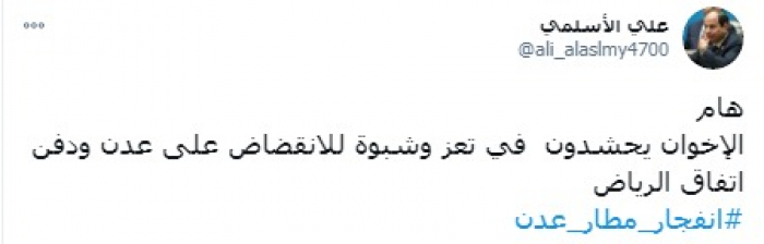 وقال في تغريدة على حسابه بموقع التدوين المصغر، تويتر، اليوم إن: "الإخوان يحشدون في تعز وشبوة للانقضاض على عدن ودفن اتفاق الرياض".